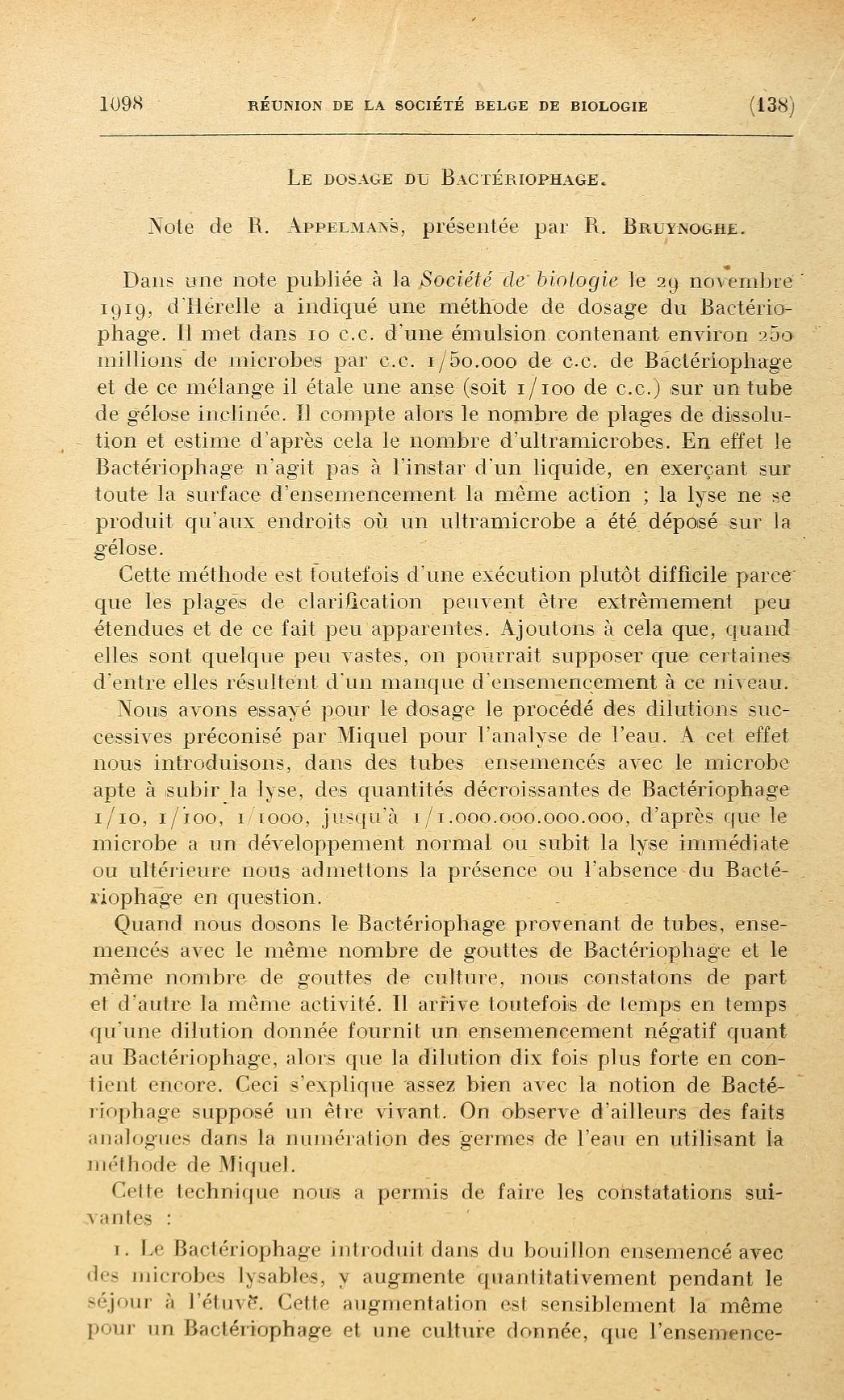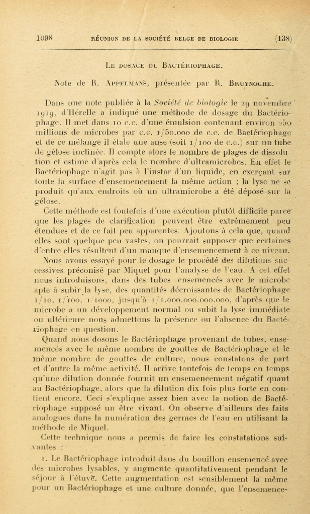 Le Dosage Du Bactériophage, Note de R. Appelmans, présentée par R. Bruynoghe, Réunion de la Société Belge de Biologie, 1921, pp. 1098-1099, a Google Translation