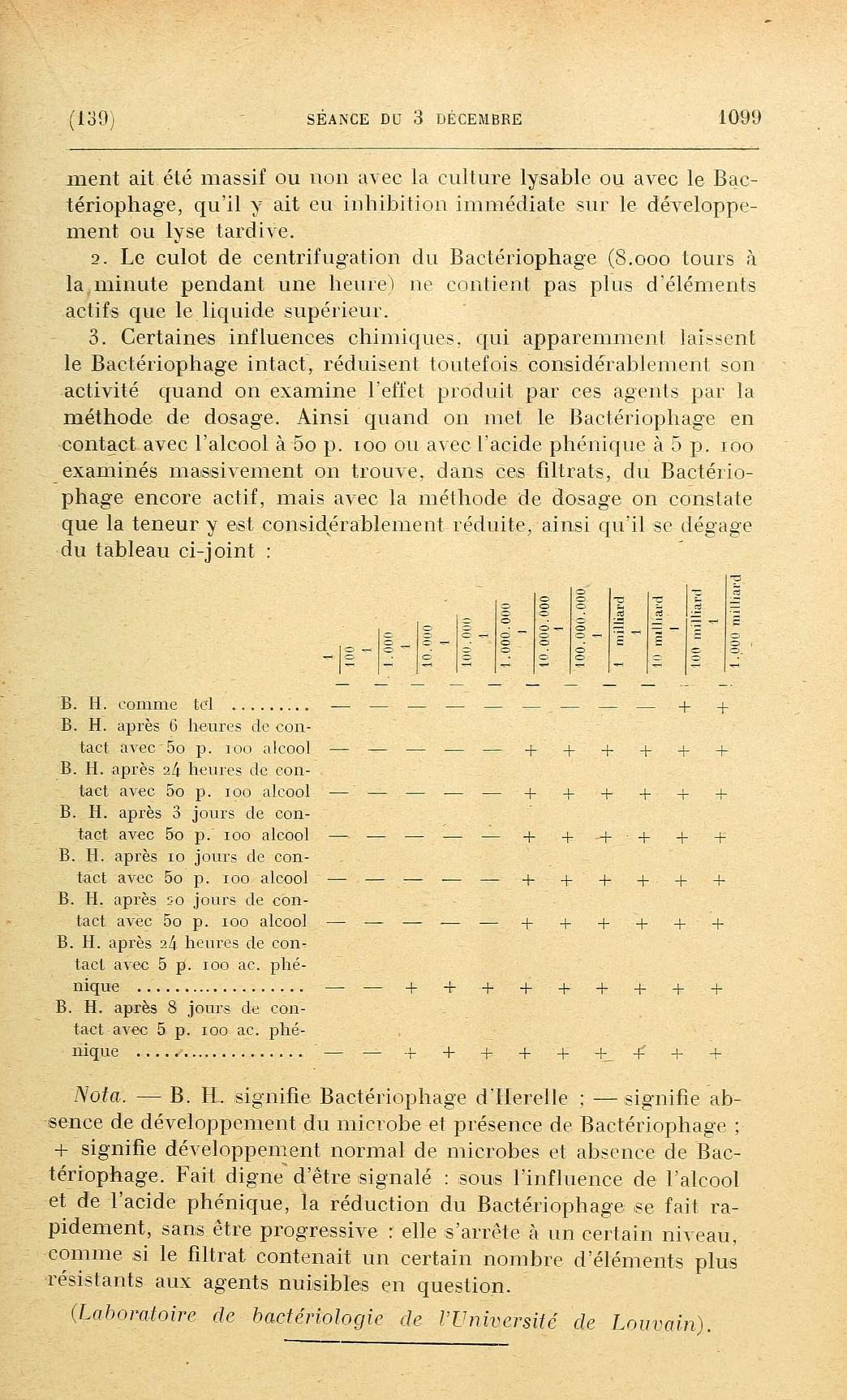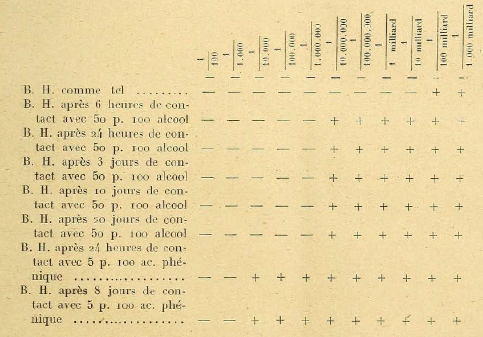 ¶ Note. — B. H. means Bacteriophage d’Herelle; — means absence of development of the microbe and presence of Bacteriophage; + means normal development of microbes and absence of Bacteriophage. Fact worthy of being noted: under the influence of alcohol and carbolic acid, the reduction of Bacteriophage occurs quickly, without being progressive: it stops at a certain level, as if the filtrate contained a certain number of elements more resistant to the harmful agents in question.
